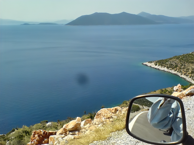 So, we finish this epic thing unscratched and we're now back on tarmac near Sarakiniko. Still heading South as you can see on what Pat calls "poor man's GPS" hanging on his windscreen: